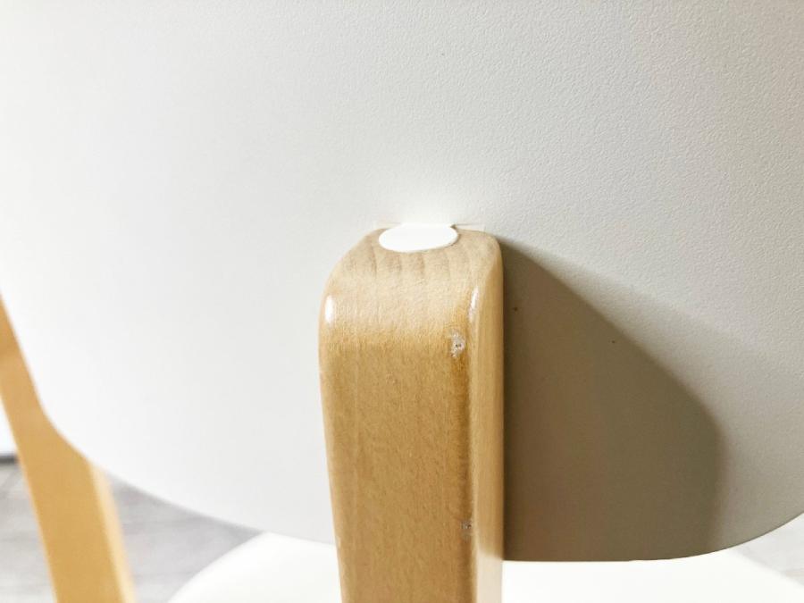 フレームに木材、背と座にプラスチックを利用した異素材の組み合わせ手が特徴的。プラスチックのパーツとフレームのジョイントにネジを使わない技術も光ります。