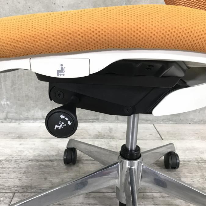 - 座面右下のダイヤル操作で、リクライニングの強弱調整が行えます。これまでのダイヤル式よりも、少ない回転数で、最弱?最強の調整が可能です。