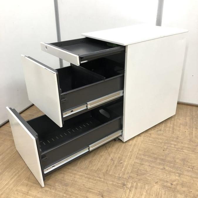 たっぷり収納できる3段デスクインワゴン オカムラ プロユニットワゴン サイド把手 ホワイト 鍵付き シリンダー錠在庫がある店舗一覧