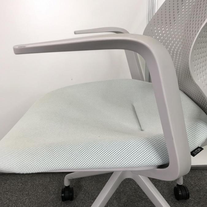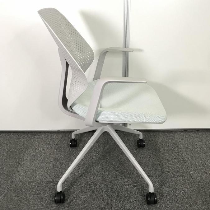★【商品入替のため、残り2脚限り】イトーキ製 キュア ペールアクアブルー 肘付き 4本脚 背面樹脂メッシュタイプ 固定肘 オフィスに新しい風を吹き込むライトタスクチェア! 腰回りをしっかりサポート! ミーティングチェア!!