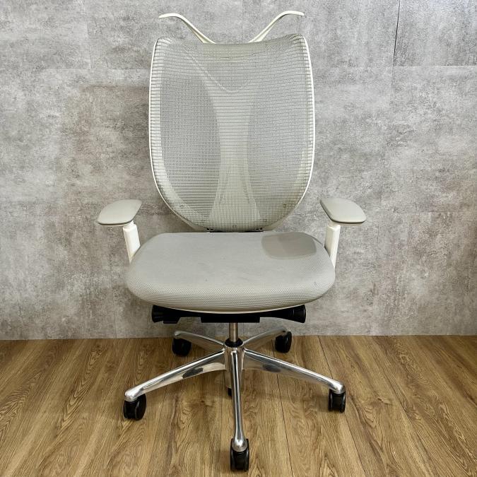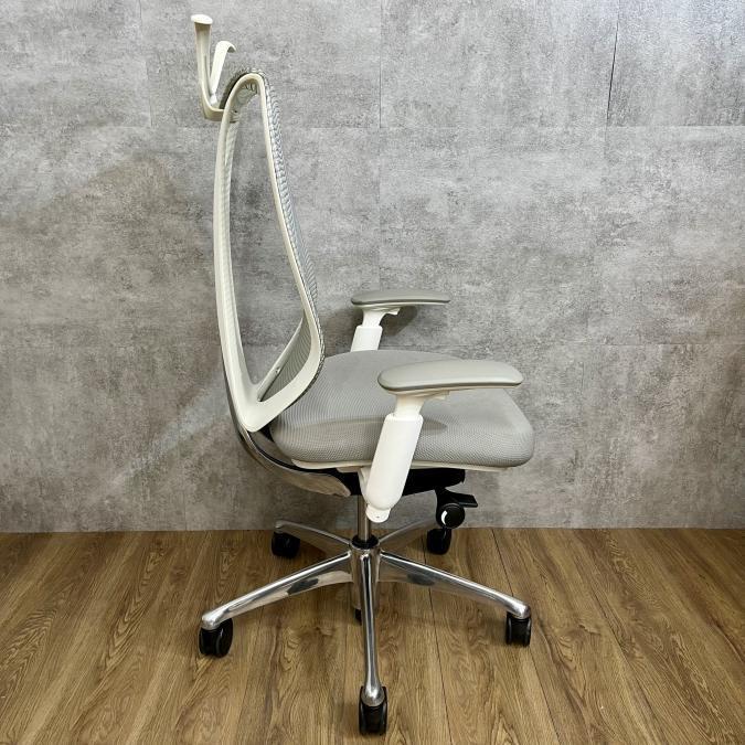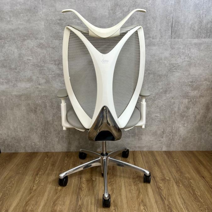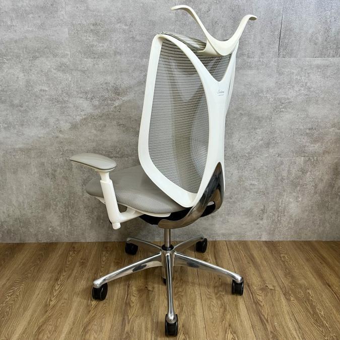 【前傾チルト付!流れるような美しいフォルムの最高級メッシュチェア!】■オカムラ(okamura)製 Sabrina(サブリナ)チェア 肘付ハイバック ■アジャストアーム(可動肘) ■背面メッシュ ■ライトグレー × ホワイトフレーム