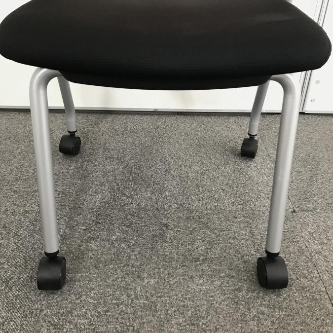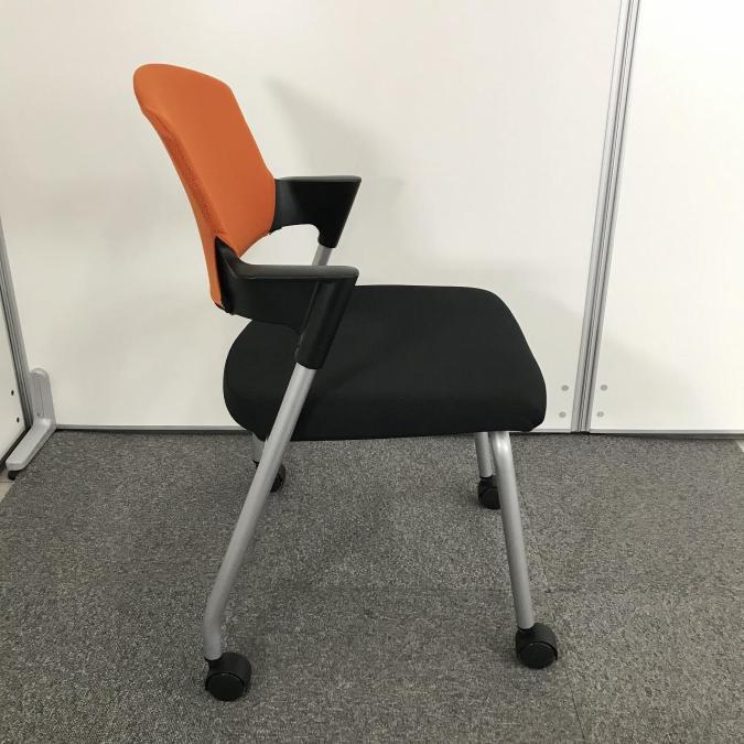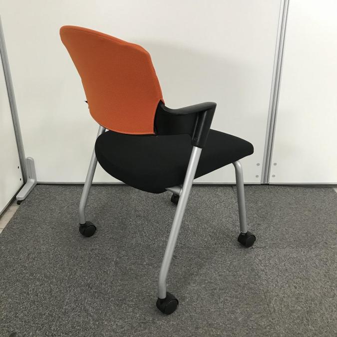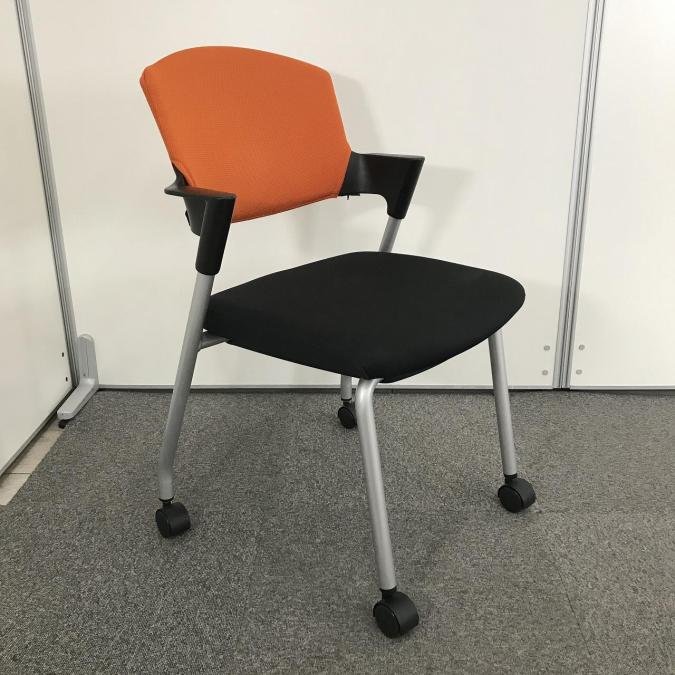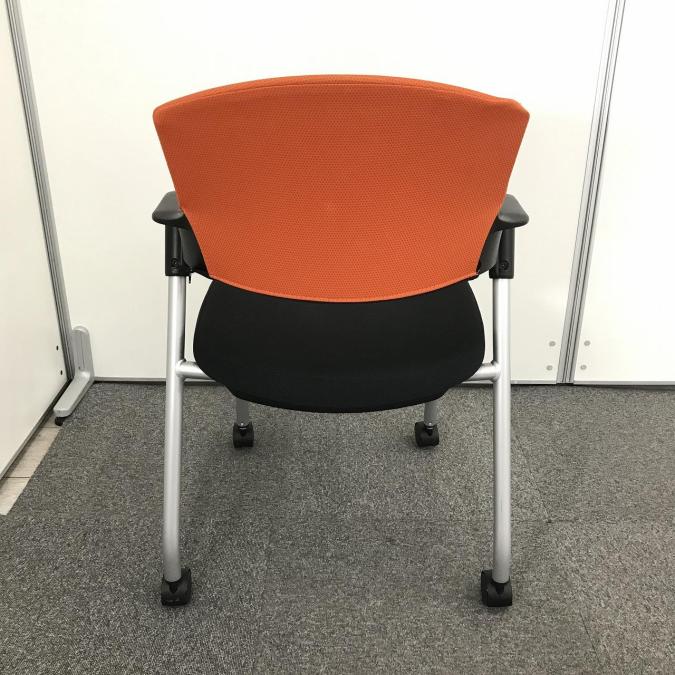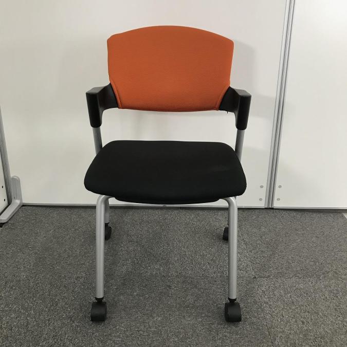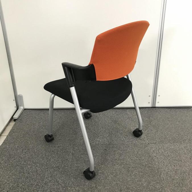 【シンプルスマートなスタッキングチェア!分厚いクッションで長時間でも快適な座り心地!】■コクヨ製 プロッティ スタッキングチェア ミーティングチェア ■固定肘 ■キャスター付 ■背面カバー付き ■背面オレンジ×座面ブラック- なんば日本橋店