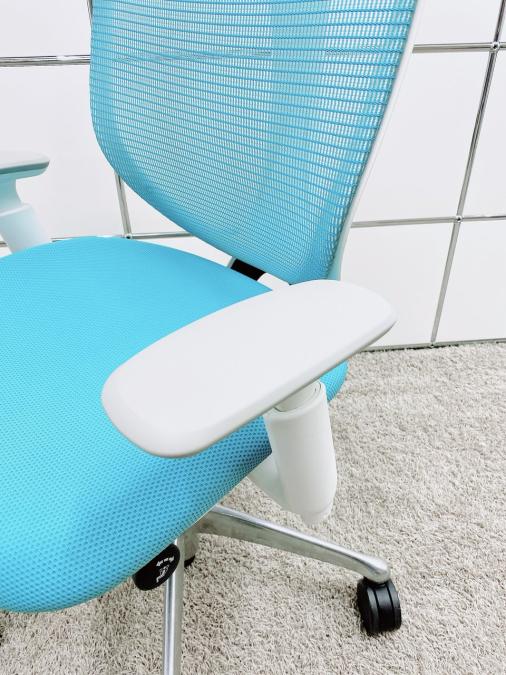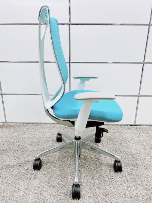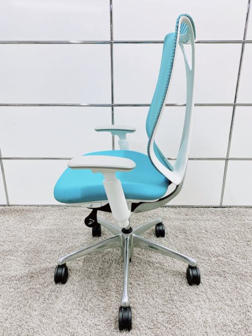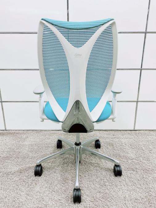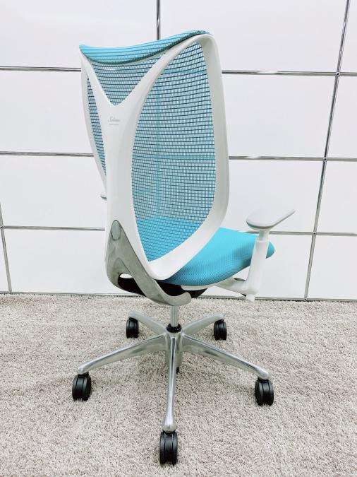 【T11】【T9】【K7】【商品入替のため、残り5脚限り】オカムラ製 サブリナシリーズ アクアブルー 背もたれ/アクアブルーx座面/ダークブルーのツートンカラー ホワイトフレーム アジャストアーム※可動肘 前傾チルト付 流れるような美しいフォルムの最高級メッシュチェア! 肘付きハイバックチェア!!