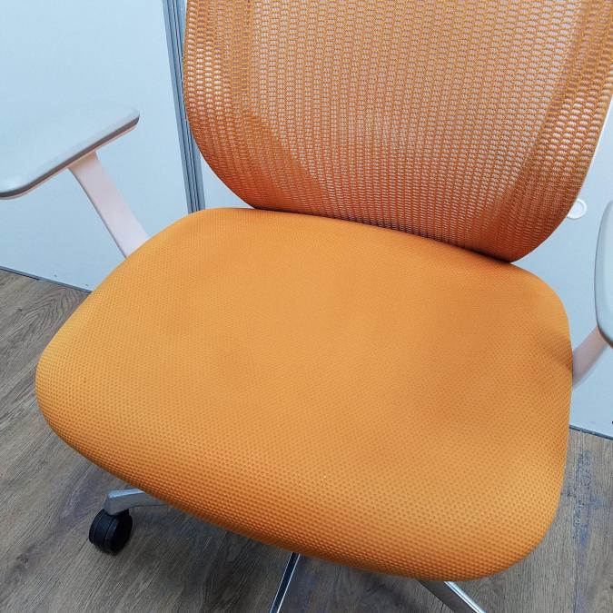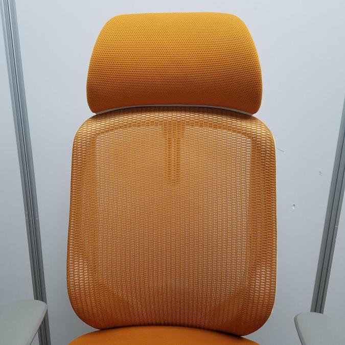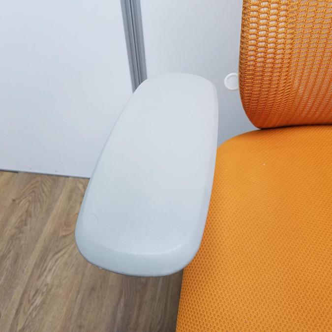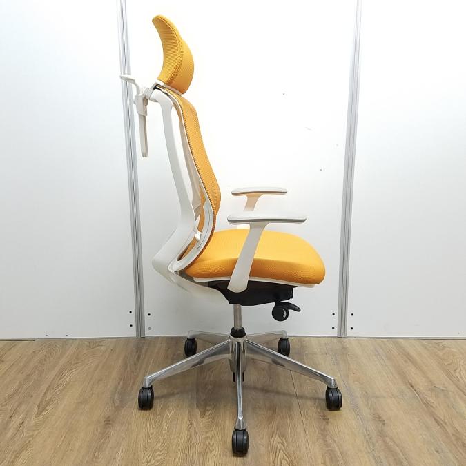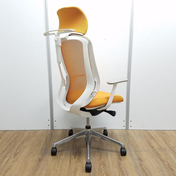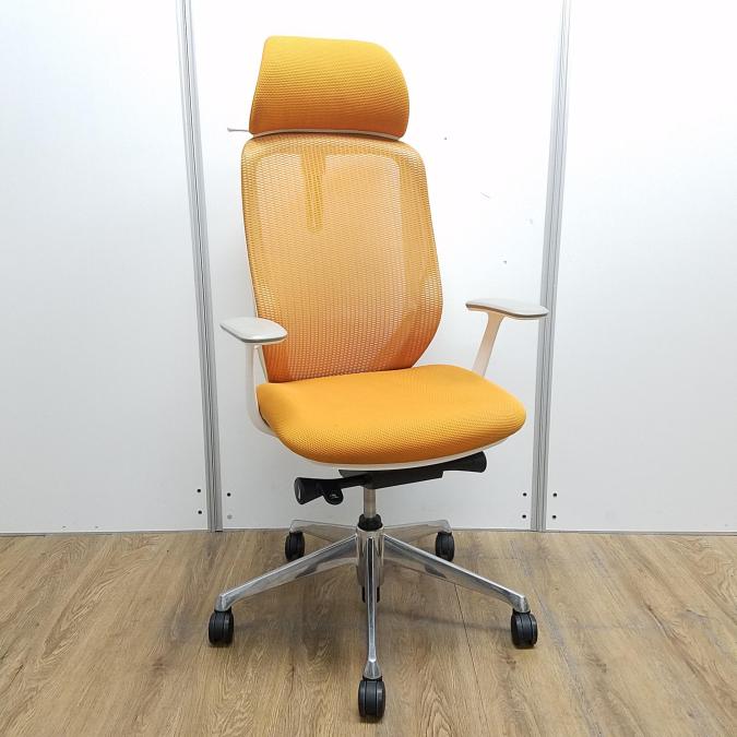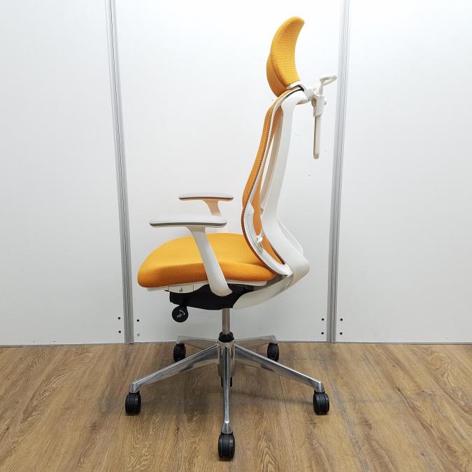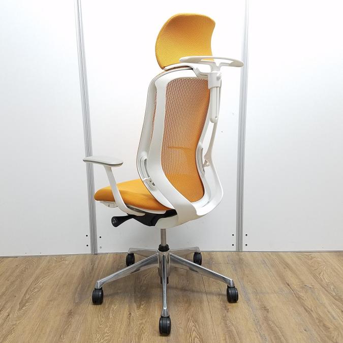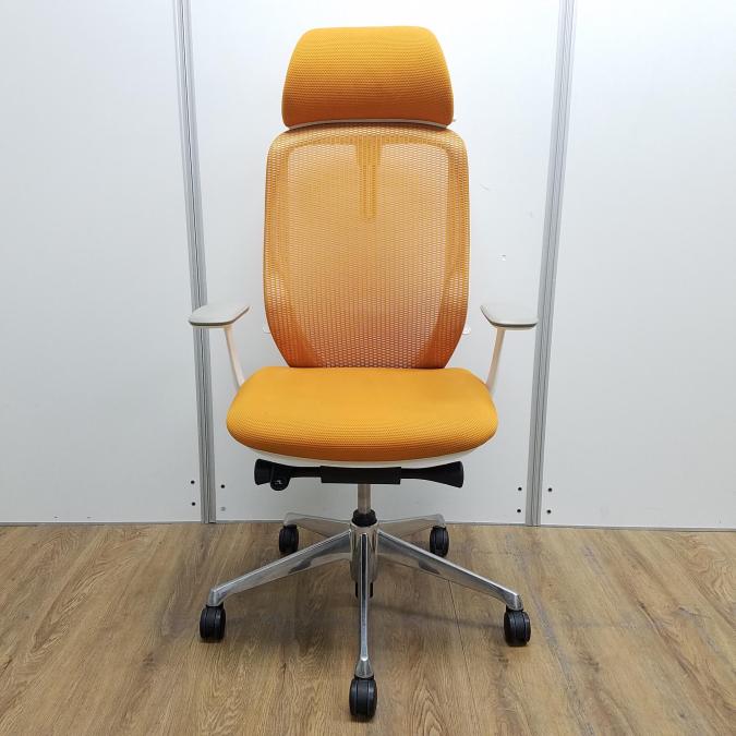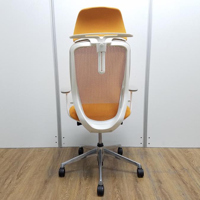 【現品限り】オカムラ製 シルフィーシリーズ オレンジ ホワイトフレーム ヘッドレスト デザインアーム※固定肘 ポリッシュ脚 肘付きハイバックチェア!!- 京都東寺店