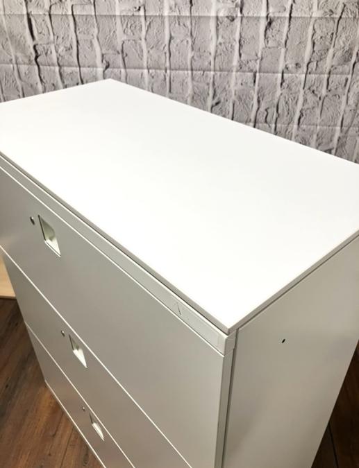 オカムラ レクトライン 3段ラテラル書庫 ホワイト天板 シリンダー錠 鍵付き ※取っ手部分に若干日焼けあり