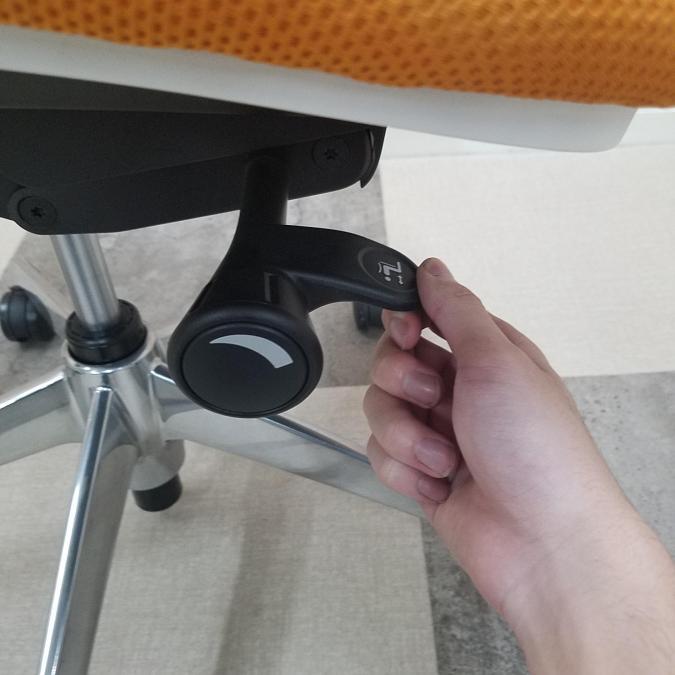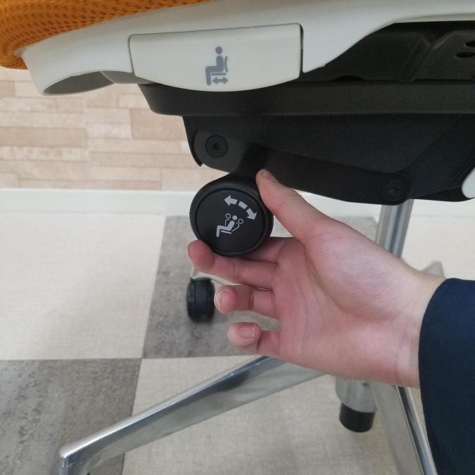 - 座面右下のダイヤル操作で、リクライニングの強弱調整が行えます。これまでのダイヤル式よりも、少ない回転数で、最弱?最強の調整が可能です。