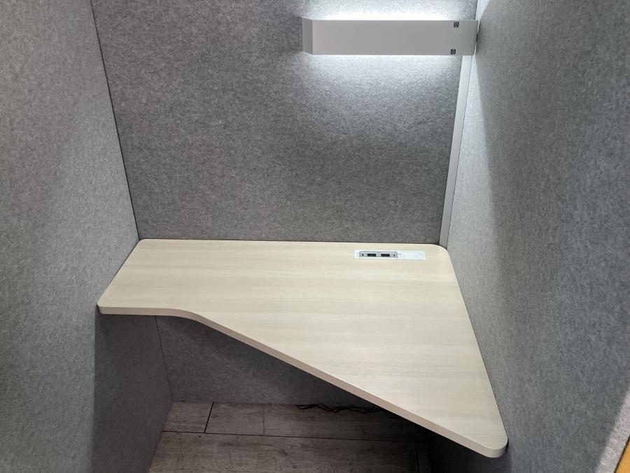 視線がブースの角に向かい、周囲の人の動きが視界に入りにくくなるようにデザインされたワーク天板。