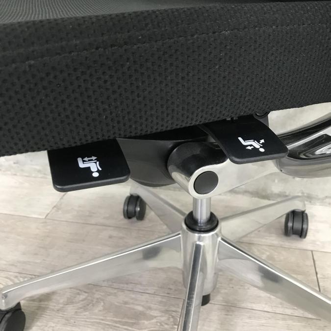 座面の高さや前後などの基本的な調整レバーが座面裏の前方に集約されており、姿勢を変えずに調節ができます。
