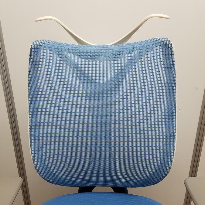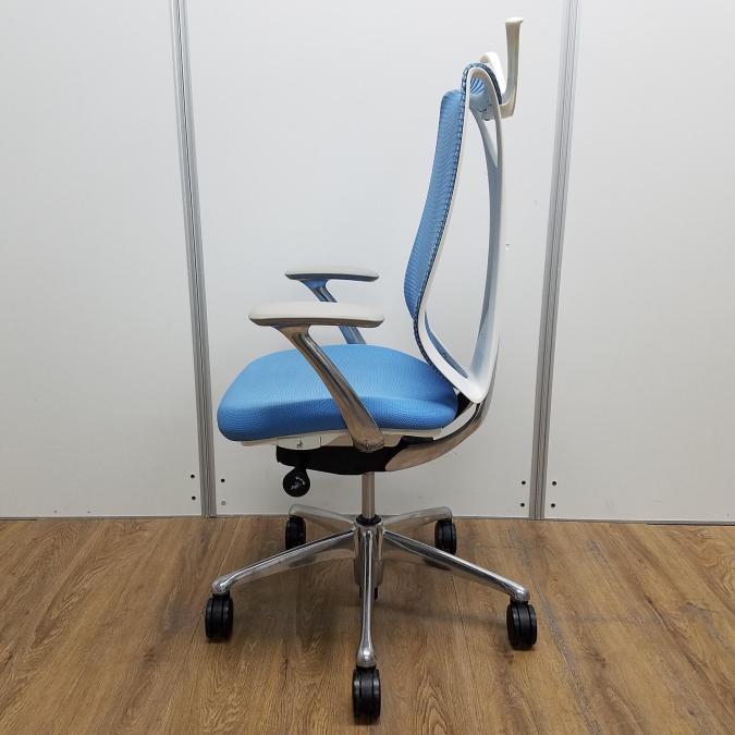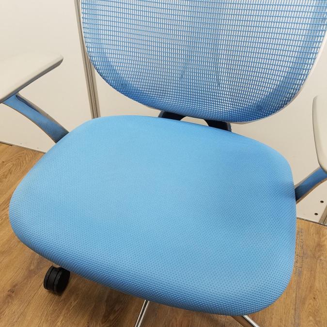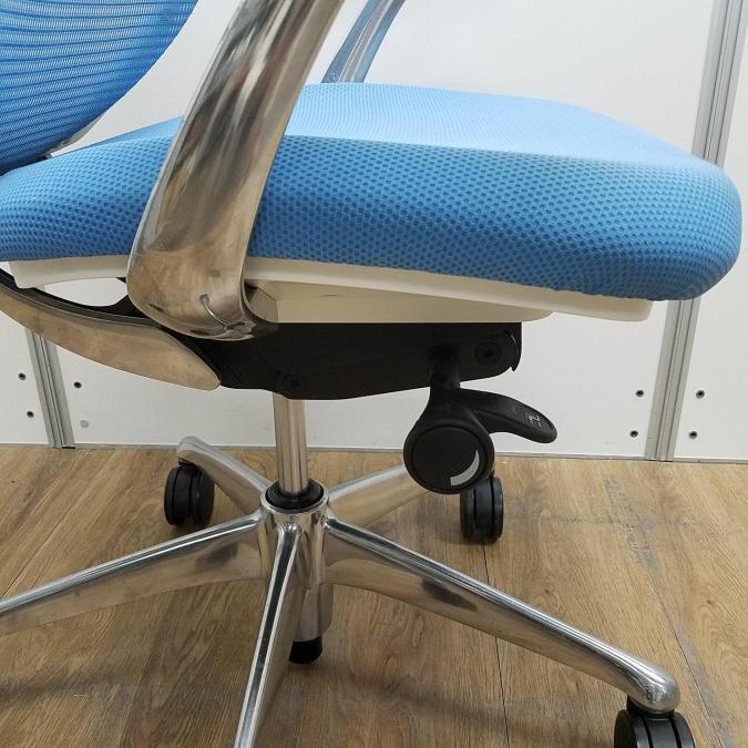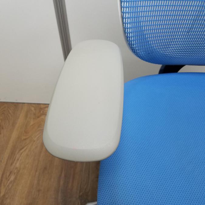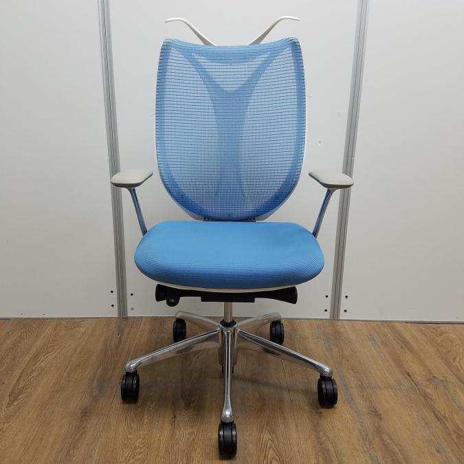 【商品入替のため、残り1脚限り】オカムラ製 サブリナ シリーズ アクアブルー デザインアーム※固定肘 背面メッシュ ハンガー付 リングフレームとメッシュが背中をやさしく受け止める・最高級メッシュチェア! 肘付きハイバックチェア!!- 京都東寺店