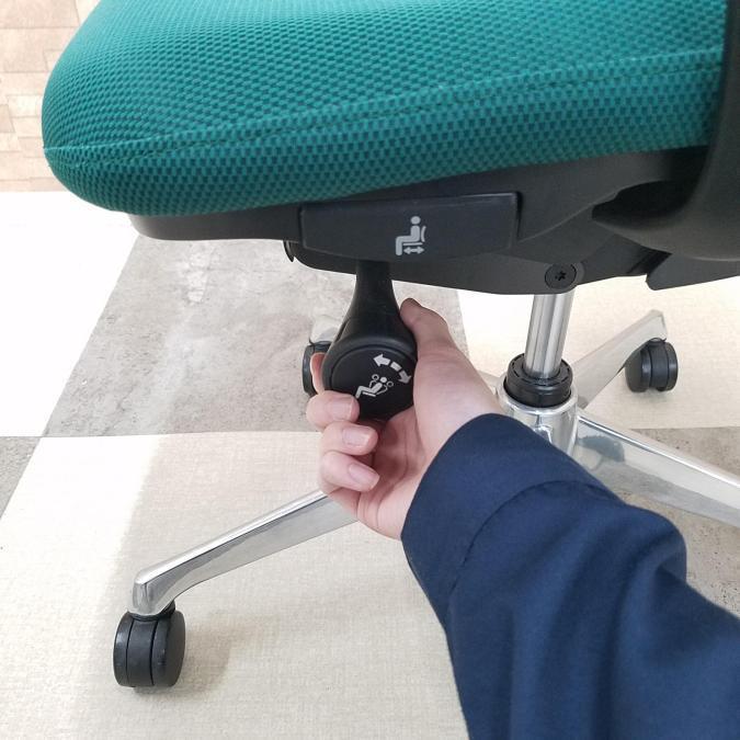 - 座面の左にあるレバー操作により、座面の奥行き調整が可能です。(ストローク:50mm)