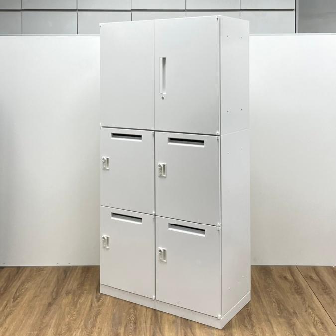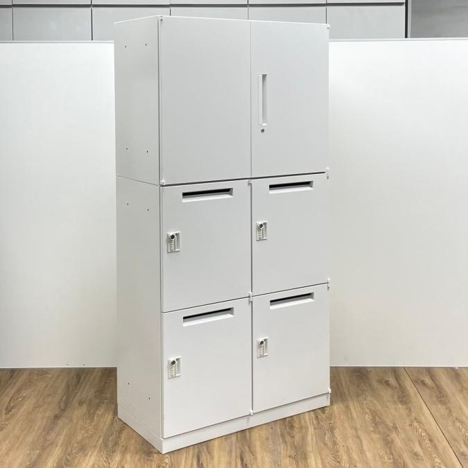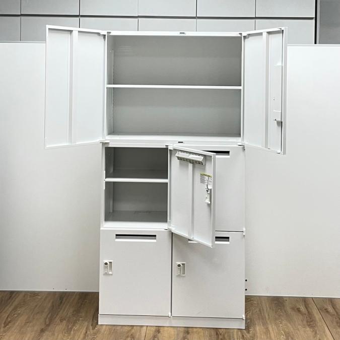 【商品入替のため、残り1台限り】ウチダ製 HSシリーズ ホワイト 上:シンリンダー錠/下:ダイヤル錠式 投函口付 フリーアドレスやコワーキングオフィスの相棒に 上:両開き/下:4人用パーソナルロッカー 上下セット!!※非常は解除キーは付属しておりません。- 京都東寺店