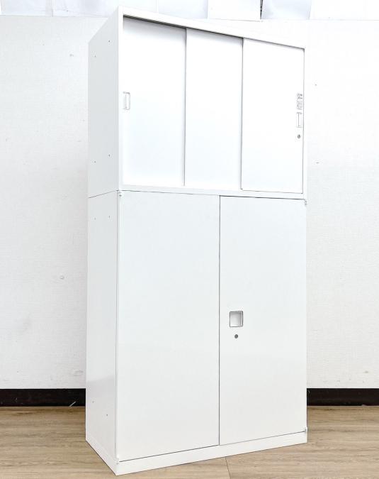 スライド式の扉+引き出しタイプの便利な書庫セットが入荷!使い勝手抜群のハイキャビネットが入荷! ■オカムラ/レクトライン/ホワイト 2枚引き戸+3段ラテラルキャビネット
