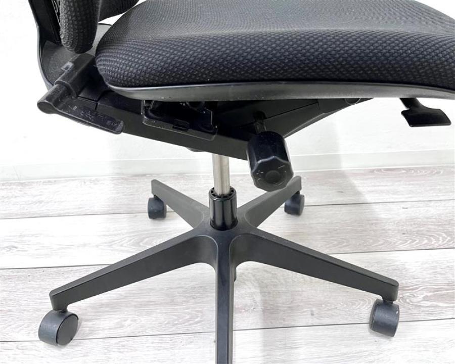 例えば、座面は、イトーキ独自の"ベンディングシート"という機構により、クッション、インターシェル、空洞という三層構造になっています。 この真ん中に挟まっているインナーシェルが、着座時の姿勢に合わせて体重を分散してくれるので、どんな姿勢でも体になじみ、疲労を軽減してくれます。 さらに、座面は前後に4センチほど奥行きを調整でき、前傾姿勢で座りたい、深く腰掛けたい、膝裏を圧迫されたくないなど、個人の好みに合った快適さにカスタマイズが可能となっています。