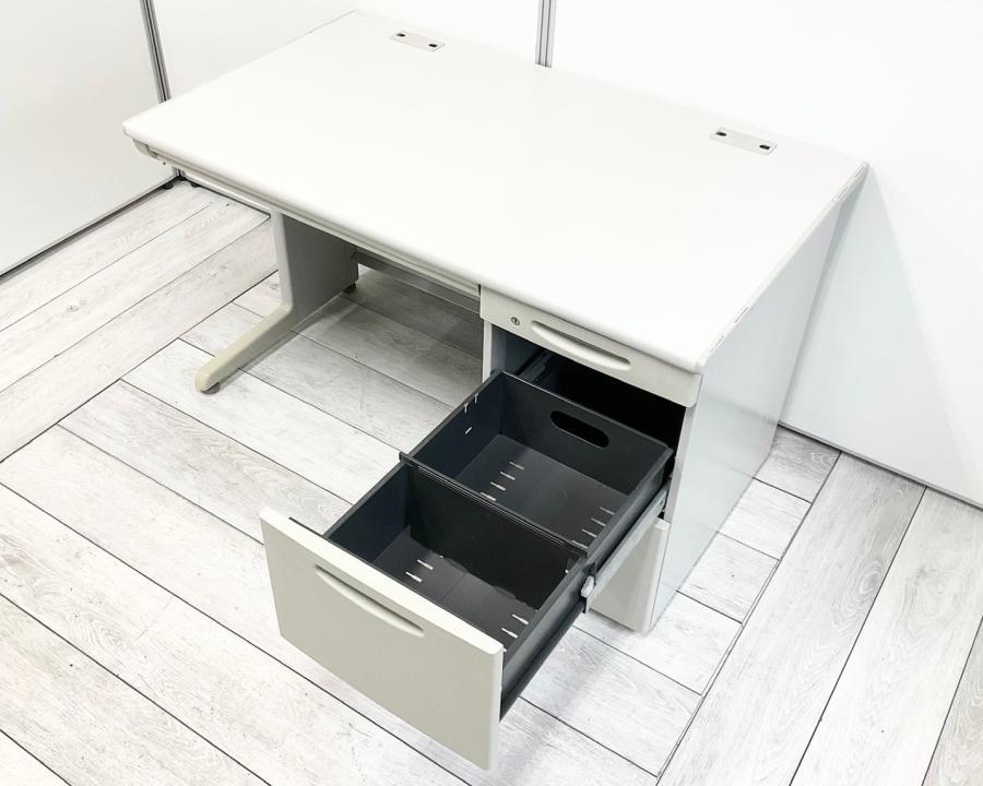 【定価約11万円】【奥行800㎜】【オカムラの超定番シリーズ!袖一体型で書類をたっぷり収納可能!】■オカムラ (okamura)製 SD-Vシリーズ 片袖机 W1200mm×D800mm ■シリンダー錠 ■ライトグレー ※上段の引出し厚めタイプ