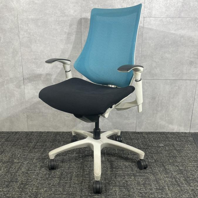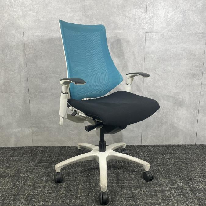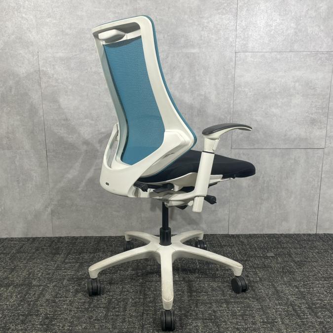 姿勢の変化にフレキシブルに対応!スタイリッシュで座り心地も抜群な大人気の高機能チェアが入荷! ■イトーキ(ITOKI) エフチェア(f)/ストロングブルー×ホワイトフレームメッシュ 背面メッシュ コートハンガー付・可動肘付 旧タイプ