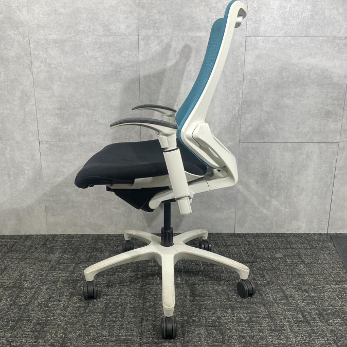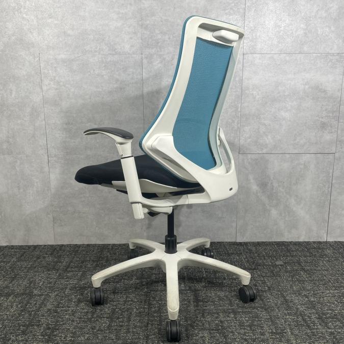 【姿勢の変化にフレキシブルに対応!スタイリッシュで座り心地も抜群な高機能チェア】■イトーキ(ITOKI)製 エフ(f)チェア 肘付き ハイバック 背面メッシュ ■可動肘・ハンガー付 ■ストロングブルー×ホワイトシェル ※日焼け有