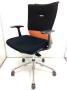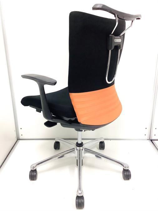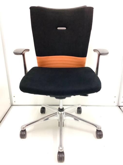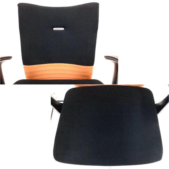 【人間工学に基づいた快適な座り心地!背あてのしなやかな曲線が背中にフィット!】■オカムラ製 フィーゴチェア (feego) 肘付きミドルバック シームレスタイプ ■固定肘 ■ブラック×オレンジ ※コートハンガー外し跡のある商品となります。【入替セールにつき30%OFF!】