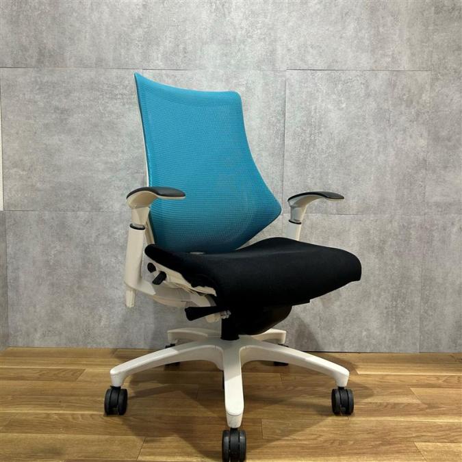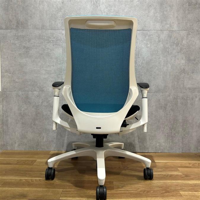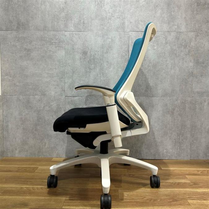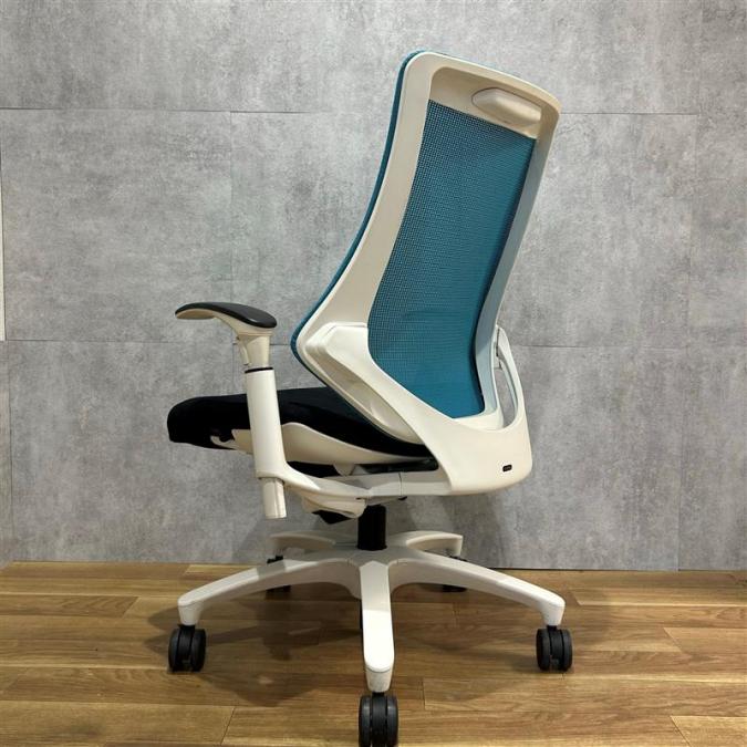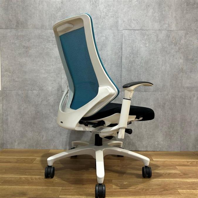 【姿勢の変化にフレキシブルに対応!スタイリッシュで座り心地も抜群な高機能チェア】■イトーキ(ITOKI)製 エフ(f)チェア 肘付き ハイバック 背面メッシュ ■可動肘・ハンガー付 ■ストロングブルー×ホワイトシェル ※日焼け有