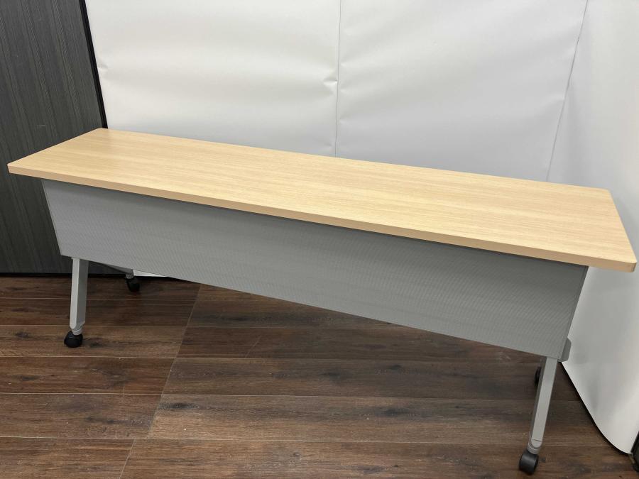 【スムーズに移動できるキャスター付きテーブルを便利な折り畳み収納で!】■オカムラ(okamura) フラプター(FLAPTOR)シリーズ サイドスタックテーブル ■W1800㎜×D450㎜×H720㎜ ■幕板パネル付 ■ナチュラル天板/シルバー脚- 岐阜店