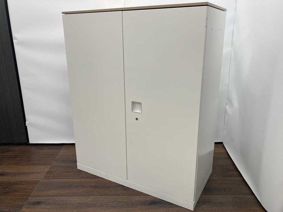 【オフィスの書類をスッキリ整理!取っ手がどの方向からでも開くマルチハンドル!天板付でカウンターにも!】■オカムラ(okamura)製 レクトライン 両開き書庫 ローキャビネット ■シリンダー錠 ■ナチュラル天板×本体ホワイト- 岐阜店