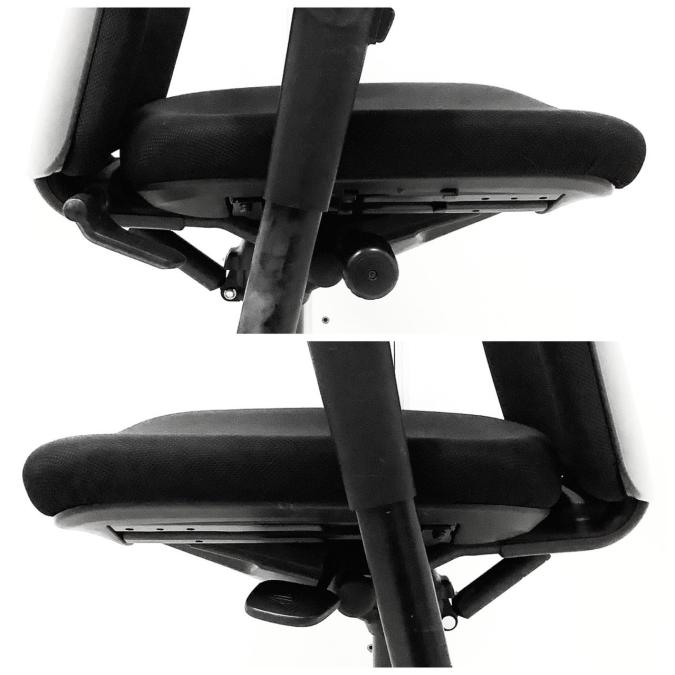 もう一つは、オカムラ社独自の""異硬度クッション""が座面に採用されていることです。これは座面が位置により異なる硬さのウレタンでできており、前方は腿裏を圧迫しないようソフトに、後方はしっかりと体重を支えるために少し硬めに作られています。クッション性とホールド感の両立により、長時間の作業での疲れを軽減してくれます。"