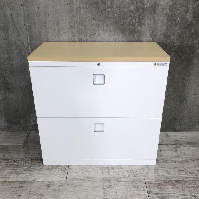 【在庫入替セール品!】【窓下の空間にもピッタリ!中古では中々出回らないナチュラル木目調天板付・高さ780mmのキャビネット!】/オススメ(おすすめ) /人気商品【弊社使用欄:A00988063】 ■オカムラ(okamura) レクトラインシリーズ 2段ラテラル ローキャビネット ホワイト ナチュラル木目調天板付き シリンダー錠- 池袋店