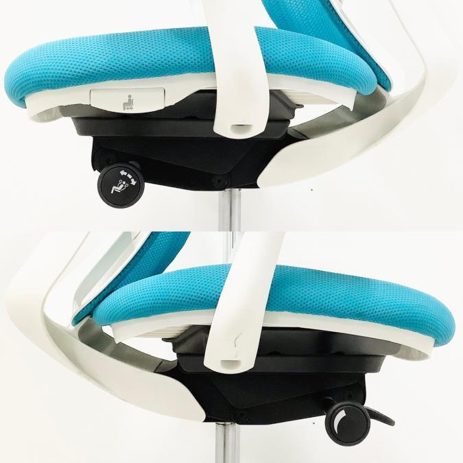 - 座面左下のダイヤルでリクライニングの固定と解除が行えます。 前傾ポジションをとることも可能です。