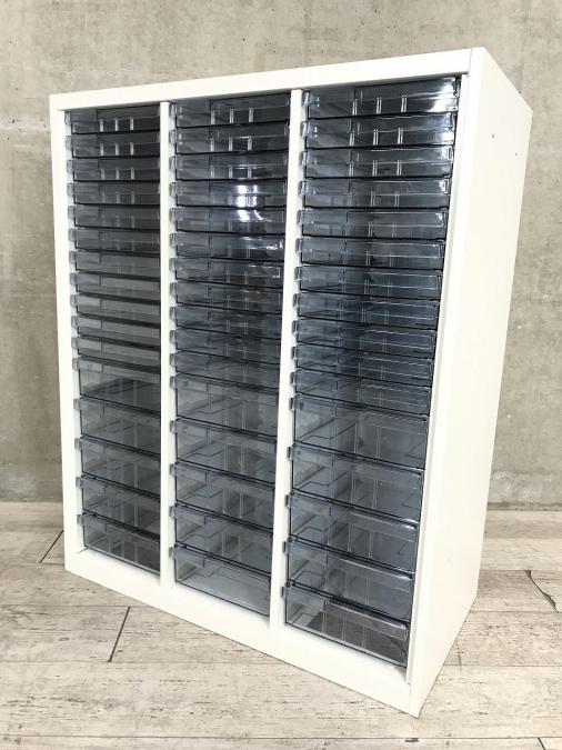 【書類・備品整理の必需品!書類や備品のストックにピッタリ!】■オカムラ(okamura)製 レクトラインシリーズ クリスタルトレイキャビネット ■3列×浅型11段+深型5段 ■ホワイト 【希少!】- 新大阪店