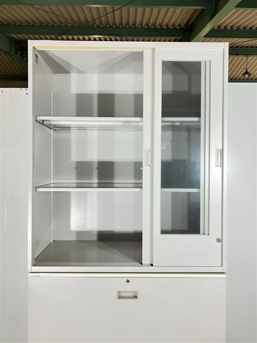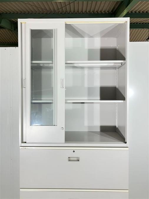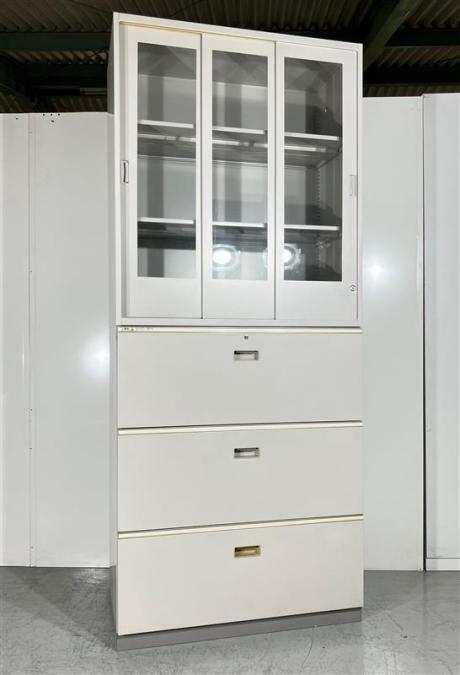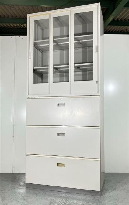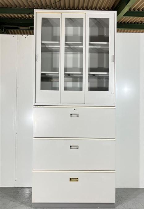 【大容量でスッキリ整理!ガラス引き戸と引き出し式書庫のセット!】■イトーキ (ITOKI)製 シンライン ハイキャビネット (3枚引き違い+3段ラテラル) ■グレー ■シリンダー錠- 新大阪店