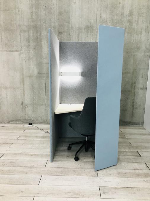 【左側デスク】【ブース+ミーティングチェアのセット!吸音パネルで仕事を快適に!】■オカムラ製 ドレープ 1人用パーティションブース テトラタイプ ■ライブスチェア付 ■ライト付 ■コンセント付 ■色:セージ (ライトブルー) 【ABW商材】【関東倉庫在庫品】【弊社使用欄:A00986616】- 全店共通商品