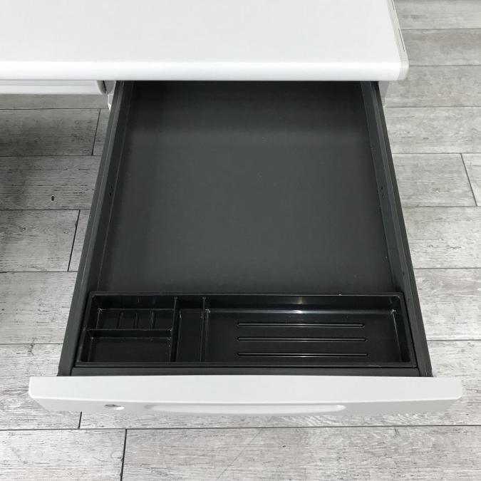 - 袖机のワゴンは、最下段がロング引出しになっており、従来より収納力120%アップ。