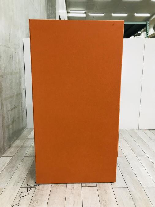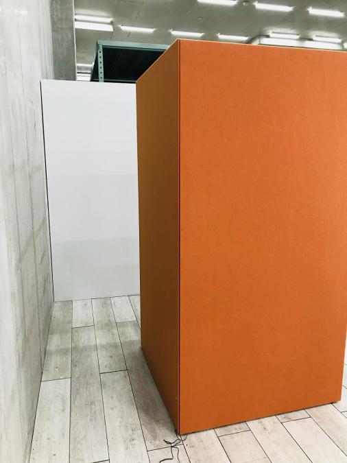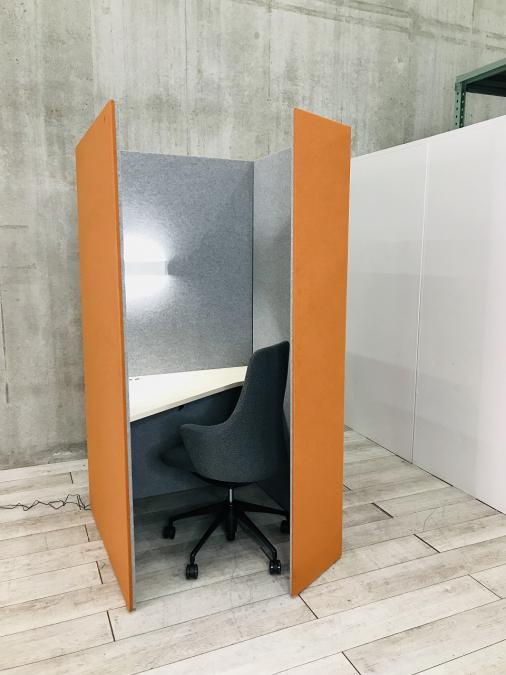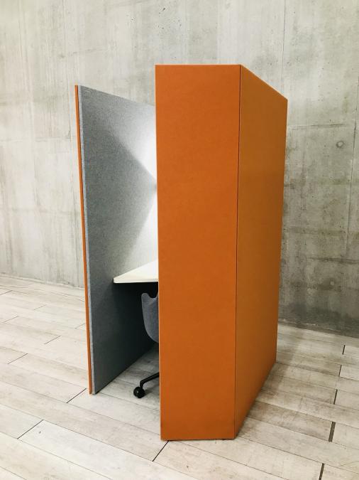 【左側デスク】【ブース+ミーティングチェアのセット!吸音パネルで仕事を快適に!】■オカムラ製 ドレープ 1人用パーティションブース テトラタイプ ■ライブスチェア付 ■ライト付 ■コンセント付 ■色:外側オレンジレッド×内側ライトグレー 【ABW商材】【関東倉庫在庫品】【弊社使用欄:A00986617】- 全店共通商品