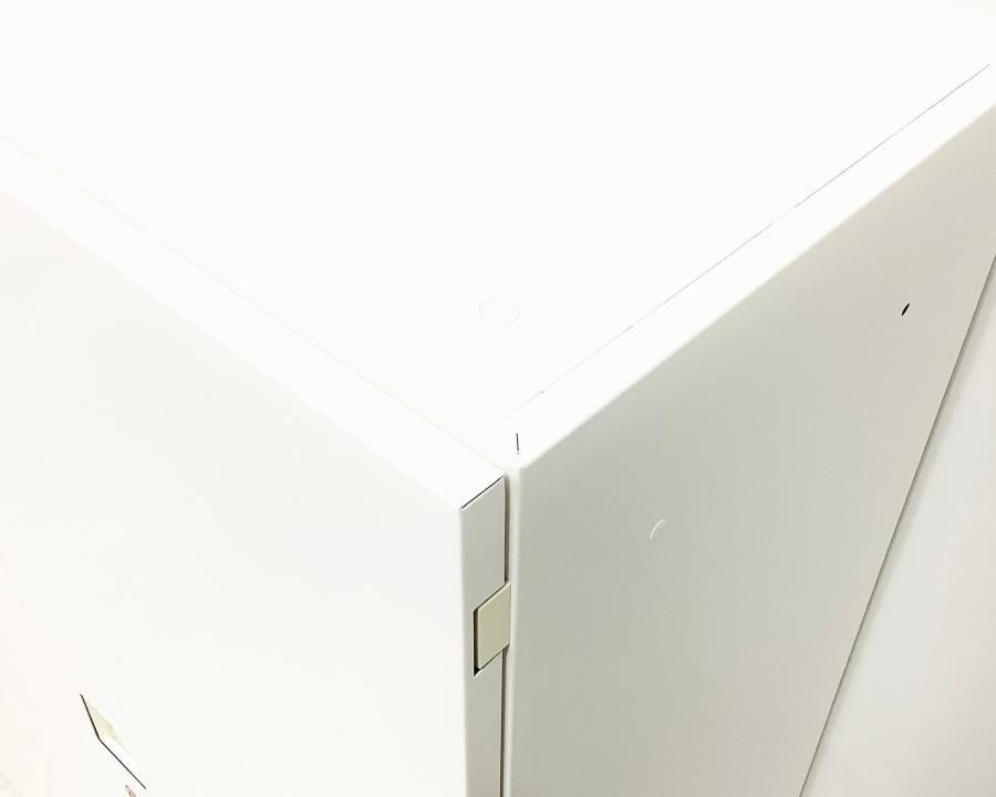 【オフィスの書類をスッキリ整理!取っ手がどの方向からでも開くマルチハンドル!】■オカムラ(okamura)製 レクトラインシリーズ 両開き書庫 ローキャビネット ■本体色:ホワイト ■シリンダー錠 ■ナチュラル天板付き