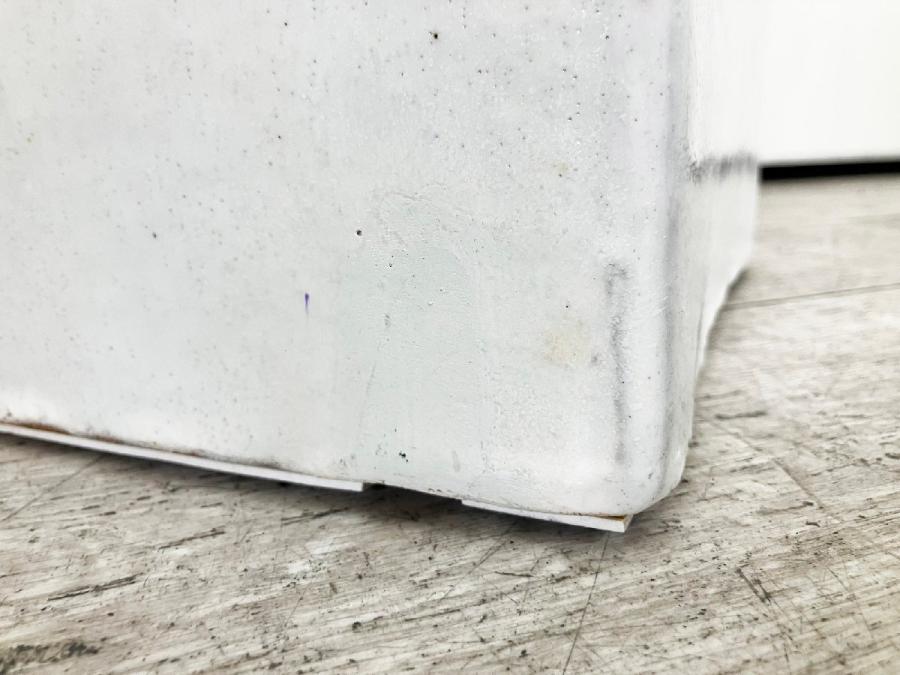 - 目立つ箇所複数あり深い傷・凹みが商品全体にある。(例、天板、幕板、棚板、サイド部分、脚部等にある。)