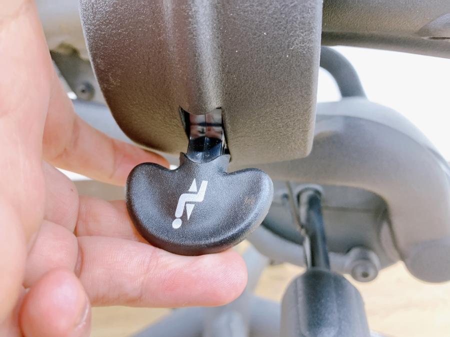 - 背もたれの裏にあるランバーサポート(パッド) の厚さは裏表で調節。上下の移動で、適切な高さ に調節できます。