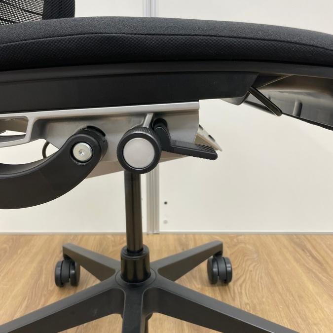 快適な座り心地に不可欠な調節機能である、上下昇降、座面の奥行き調整、リクライニングなどを備えており、操作もわかりやすく好評です。 特に、座面の奥行きは、座面下の左右に通った細いバーで調整でき、座ったままで軽やかに滑るように調整が可能です。 価格面では、新品では高めですが、中古は流通も多く、定価の3割前後の価格で高級チェアの座り心地を手に入れることができます!