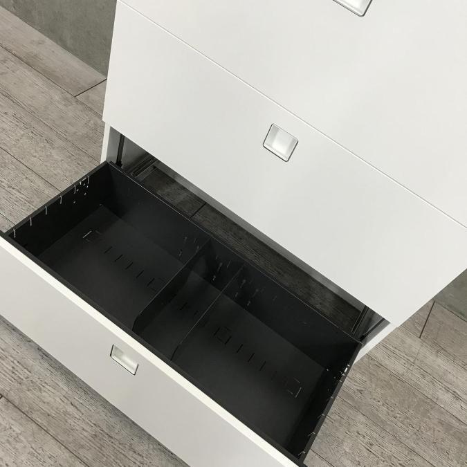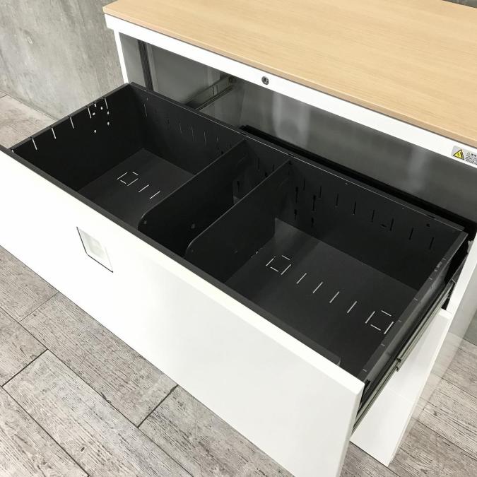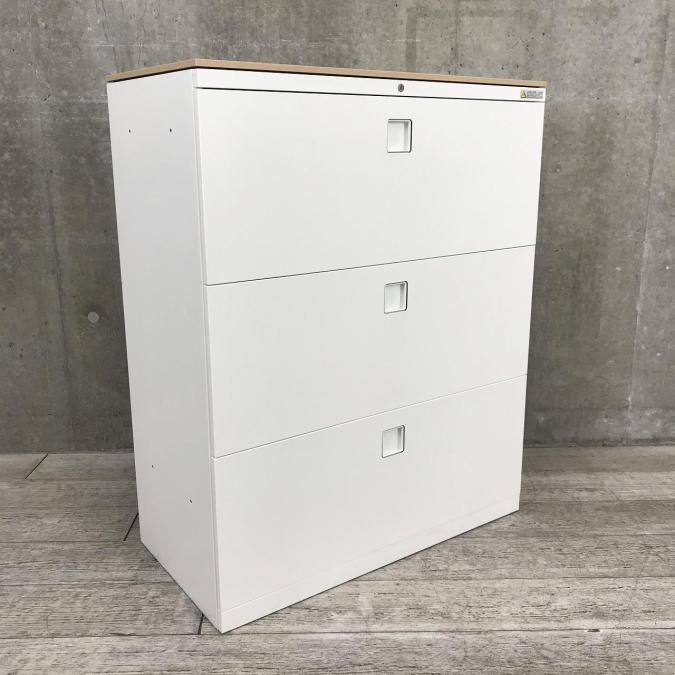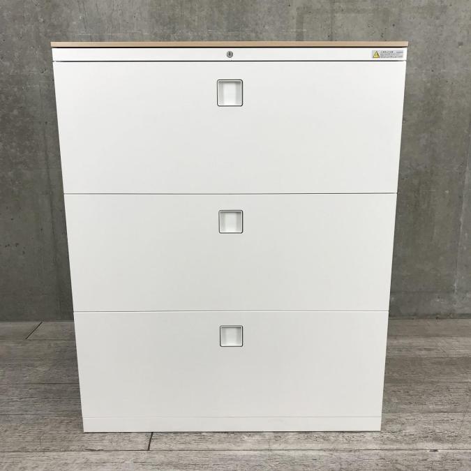【オフィスの必需品!大容量の三段キャビネット!】■オカムラ(okamura)製 レクトラインシリーズ (Rectline) 3段ラテラル ローキャビネット (W900/D450/H1115) ■天板ナチュラル×本体ホワイト ■シリンダー錠- 埼玉本店