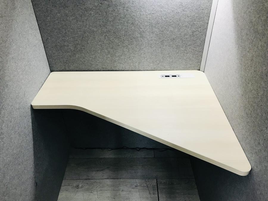 視線がブースの角に向かい、周囲の人の動きが視界に入りにくくなるようにデザインされたワーク天板。
