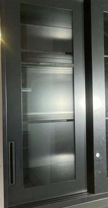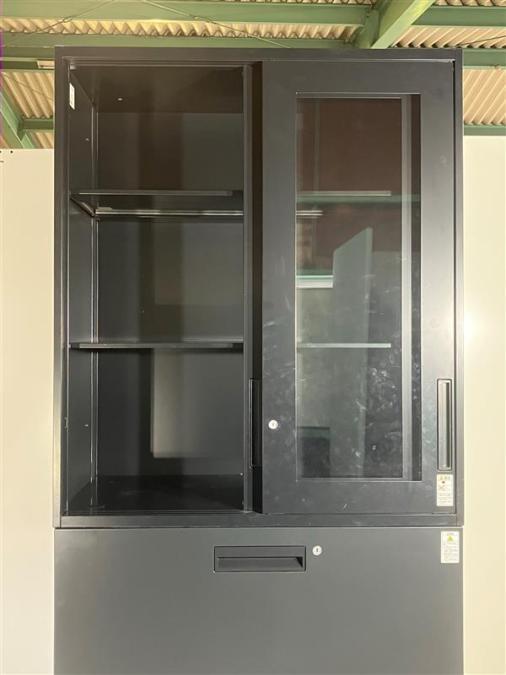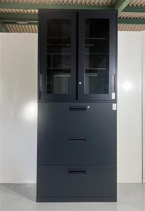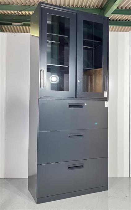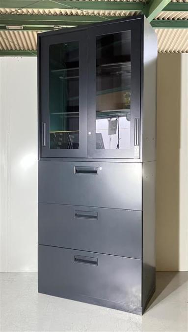 【希少なガラス引き違い扉の書庫セット!豊富な収納!】■コクヨ(KOKUYO)製 エディアシリーズ 上下書庫セット 引き違い+3段ラテラル ■ブラック ■シリンダー錠- 東大阪店