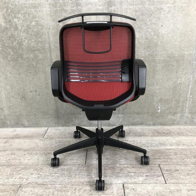 背もたれがメッシュのチェアは、構造上、外枠となるフレームが存在します。小さめのメッシュチェアは背中にフレームが当たったり、メッシュの弾性を十分に得ることができないので、一般にメッシュチェアは大型になりがちです。しかし、シロッコチェアは、フレームを横ではなく縦方向に厚くしたバーチカルフレームで強度を確保しており、 小さめのボディでありながらメッシュ面が広く作られています。