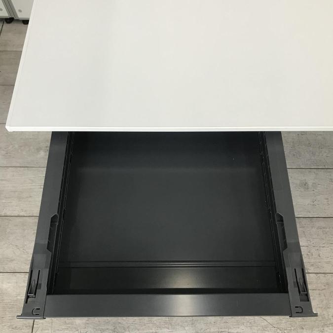 - 地震時、センター引出しが飛び出さないよう、ラッチ機構を装備。脚はデスクの横ズレを軽減させる設計になっています。