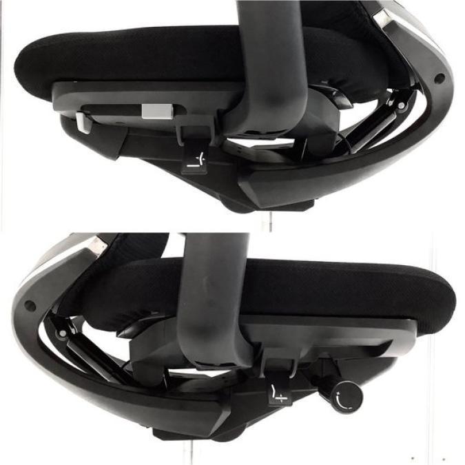 座面左前側のレバーを操作することで、前緑が20mm前傾した状態と通常位置の選択が可能。