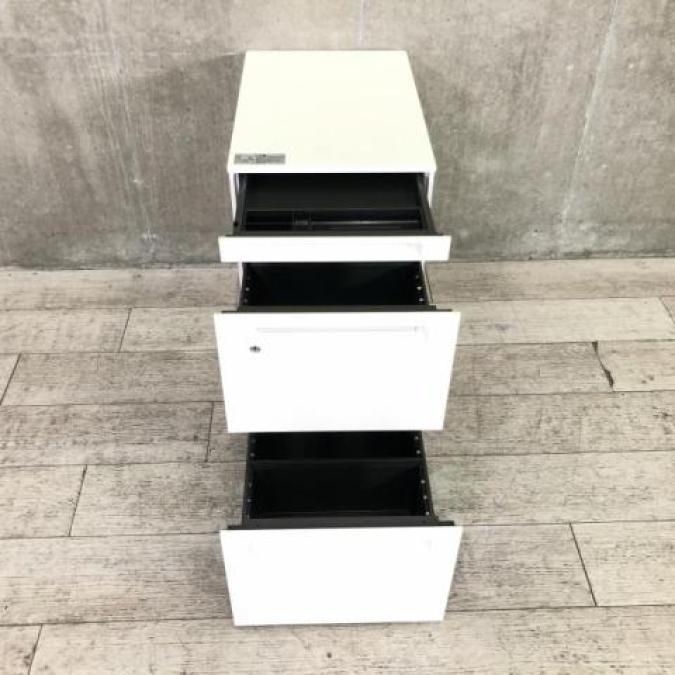 【正面に取っ手が無いフラットなデザイン!キャスター付でレイアウト変更がスムーズ!】■オカムラ(okamura)製 プロユニットシリーズ 3段ワゴン フリアド用ワゴン H650㎜ ■ホワイト ■シリンダー錠 ※キズ・塗装剝がれ有
