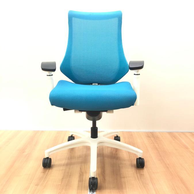 【姿勢の変化にフレキシブルに対応!スタイリッシュで座り心地も抜群な高機能チェア】■イトーキ(ITOKI)製 エフ(f)チェア 肘付き ハイバック 背面メッシュ ■可動肘・ハンガー付 ■ストロングブルー×ホワイトシェル ※日焼け有