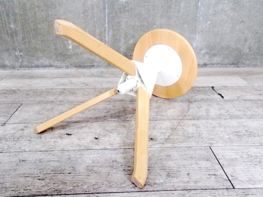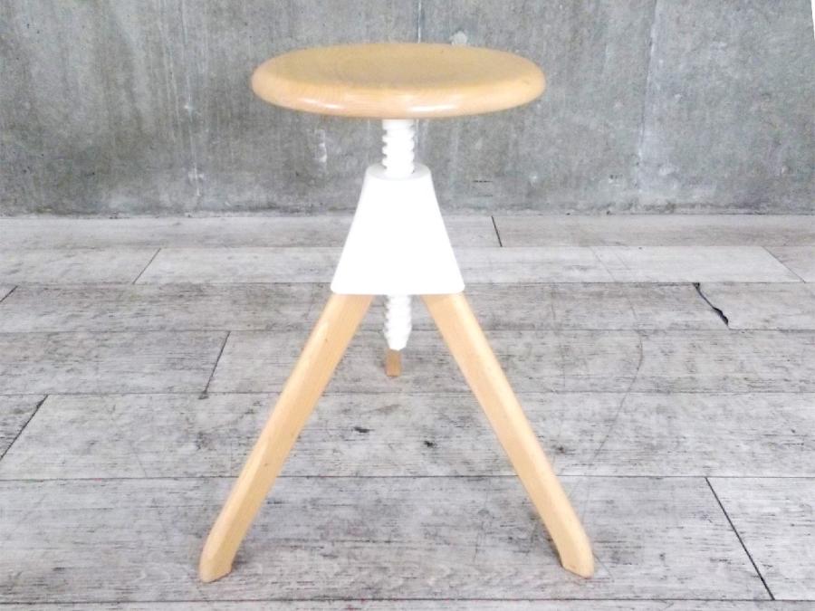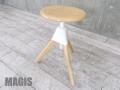 形は古典的な作業用スツールですが、機構部に使われた色鮮やかな樹脂と、木の質感との対比が斬新な印象を与えてくれます。