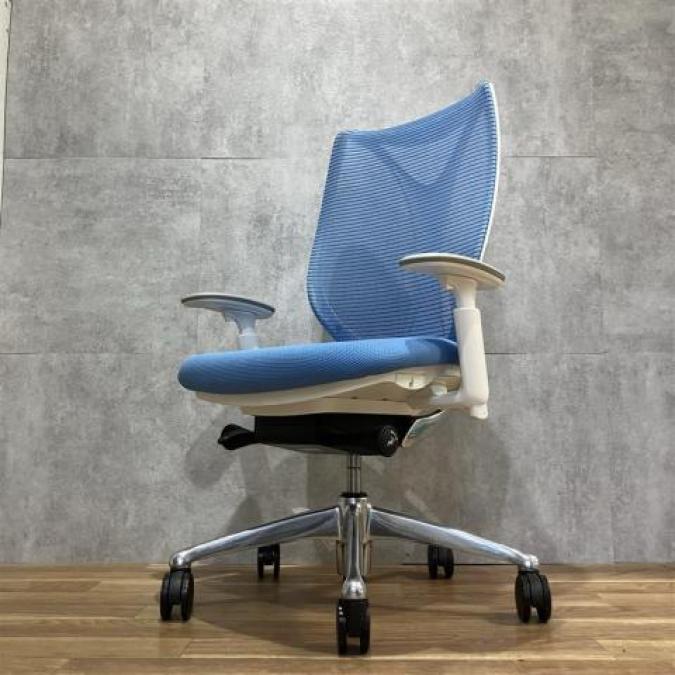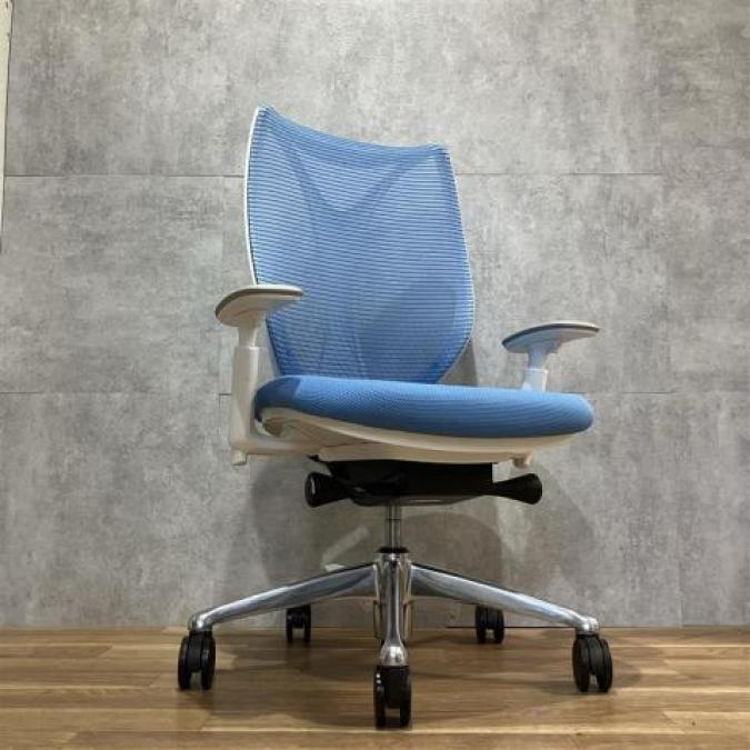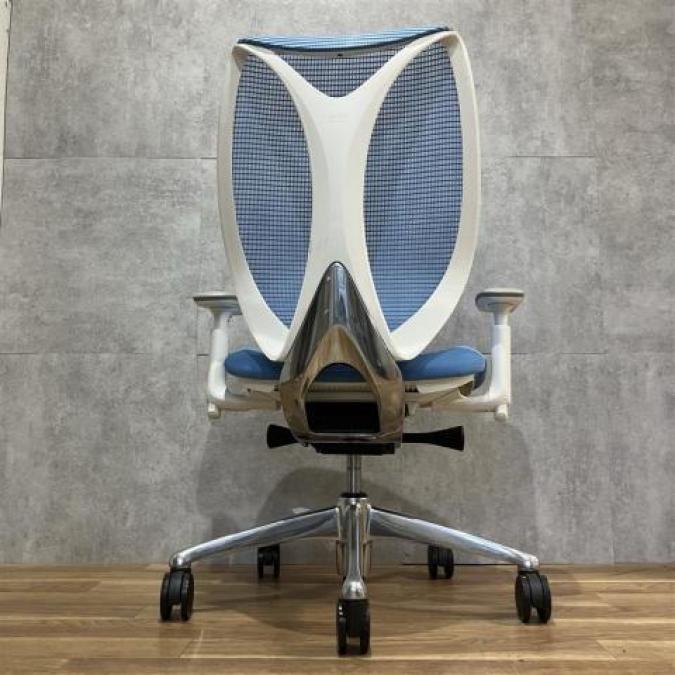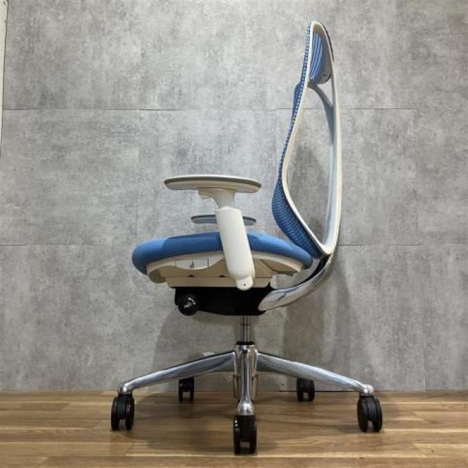 【前傾チルト付!流れるような美しいフォルムの最高級メッシュチェア!】■オカムラ(okamura)製 Sabrina(サブリナ) ハイバック 肘付き ■可動肘 ■背面メッシュ:アクアブルー 座面:ブルー ホワイトフレーム
