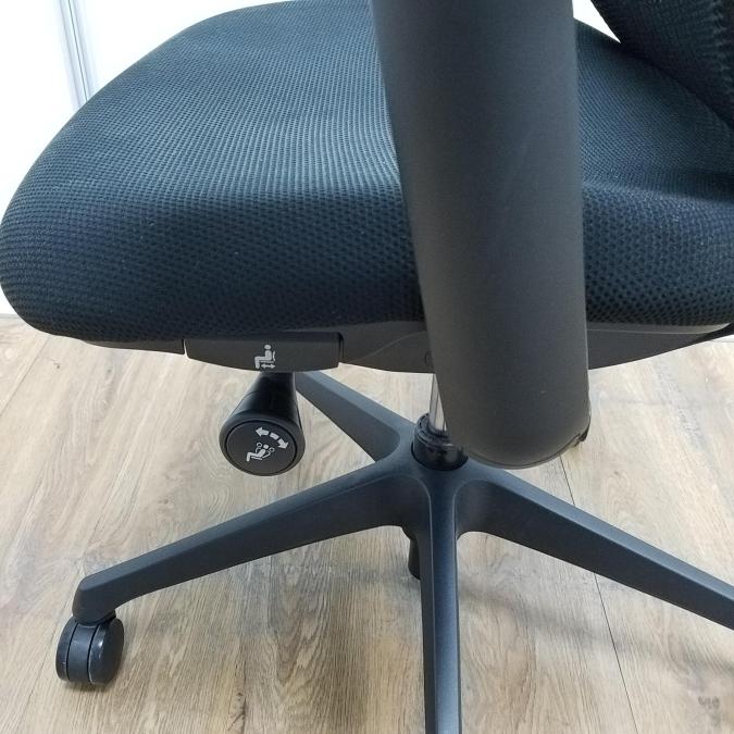 - 座面の左にあるレバー操作により、座面の奥行き調整が可能です。(ストローク:50mm)