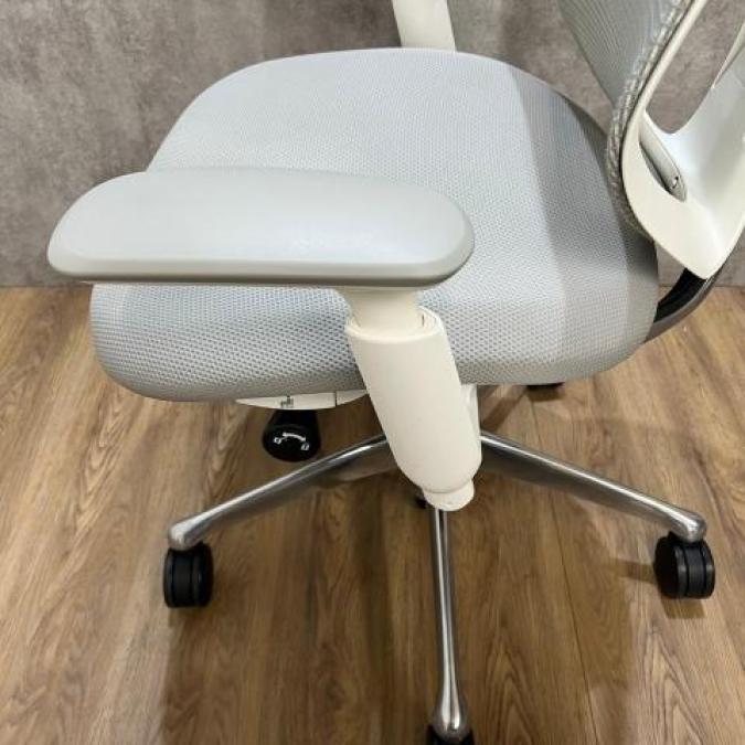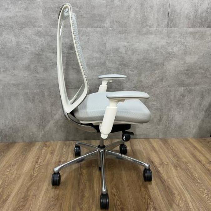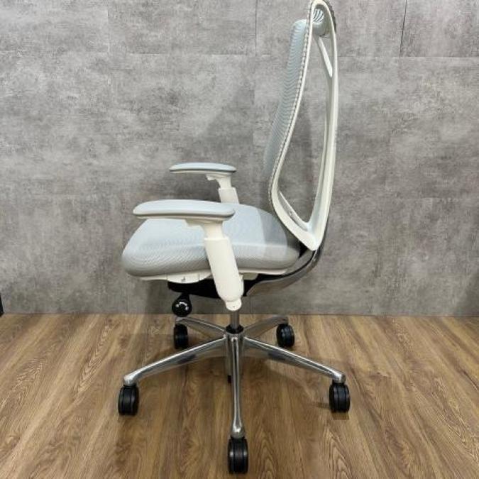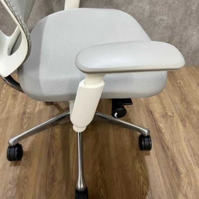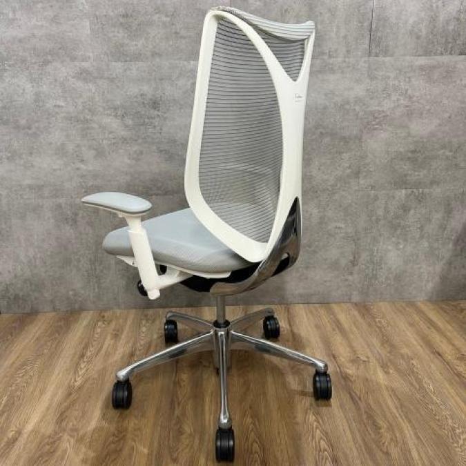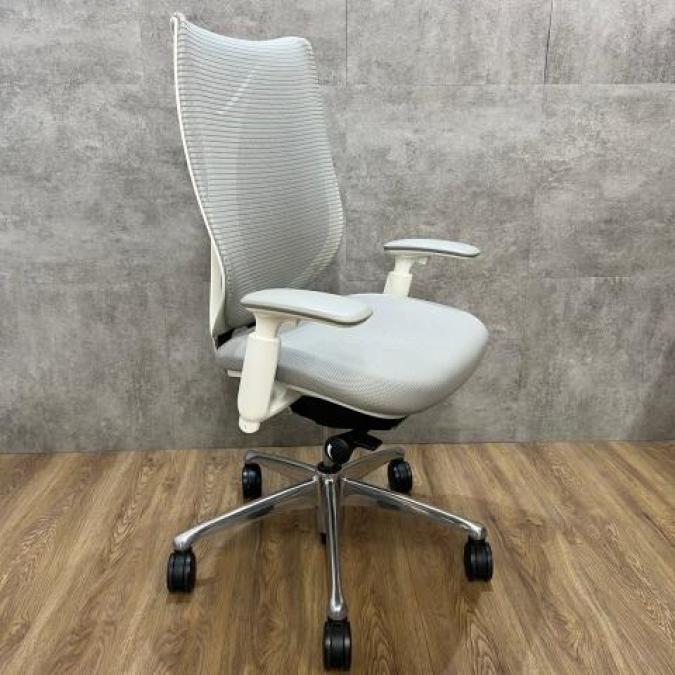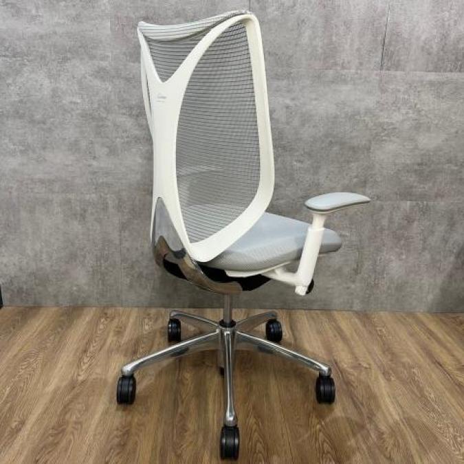 【前傾チルト付!流れるような美しいフォルムの最高級メッシュチェア!】■オカムラ(okamura)製 Sabrina(サブリナ)チェア 肘付ハイバック ■アジャストアーム(可動肘) ■背面メッシュ ■ライトグレー × ホワイトフレーム