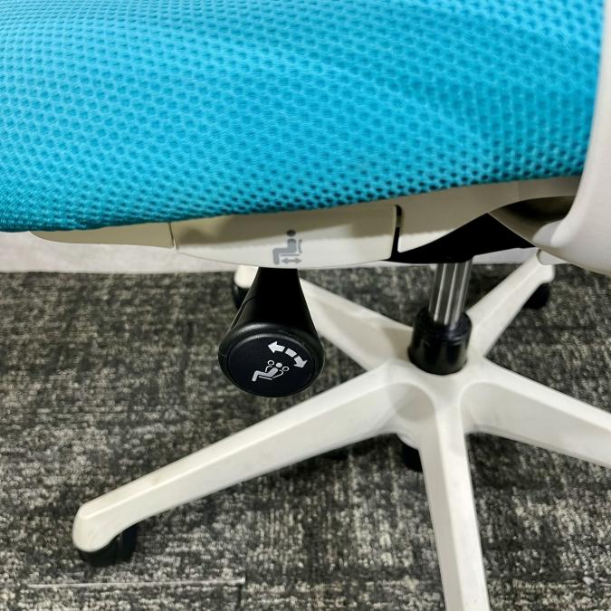 - 座面左下のダイヤルでリクライニングの固定と解除が行えます。 前傾ポジションをとることも可能です。
