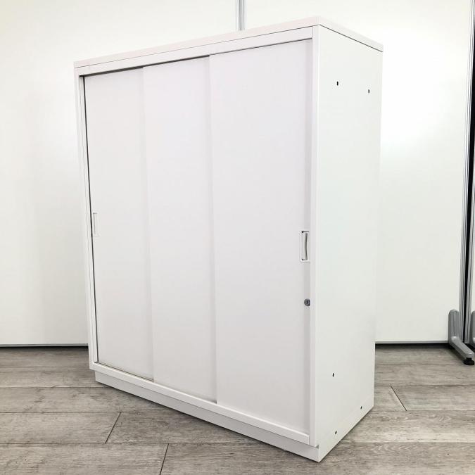 【スライド式なので開閉スペースに困りません!人気の3枚引き戸書庫!】■イトーキ (ITOKI)製 シンラインシリーズ 引き違い書庫 ローキャビネット 3枚引き戸 H1120㎜ ■天板付 ■ホワイト ■シリンダー錠